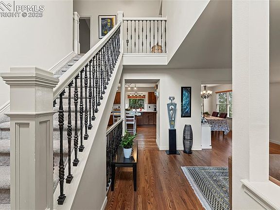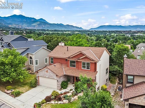 Welcome to your dream home in the picturesque community of Broadmoor Downs. Nestled among mature trees and beautifully landscaped grounds, this enchanting 4 bed, 4 bath two-story retreat offers timeless elegance, modern comfort, and breathtaking mountain views—all in one perfect package. Built in 1992 and lovingly maintained, this home features rich wood floors throughout, soaring ceilings, and floods of natural light that fill every corner with warmth. The inviting living room, complete with a cozy fireplace and expansive windows, flows seamlessly into the formal dining area—ideal for intimate dinners or festive gatherings. Upstairs, escape to the tranquil primary suite, a true sanctuary with a large walk-in closet, soaking tub, beautifully tiled walk-in shower, double vanity, and a skylight that brings in soft natural light. The fully finished basement expands your living space with a spacious family room, an additional bedroom, and a full bath—perfect for guests or quiet relaxation. Step outside to your private backyard oasis, complete with a deck and patio surrounded by lush landscaping and tall trees, creating a peaceful setting for morning coffee or sunset evenings. A new whole-home humidifier adds to your year-round comfort, and the attached 2-car garage provides convenience and storage. Ideally located near parks, schools, and shopping, this home offers the perfect blend of beauty, comfort, and location. Come experience the charm and serenity of this exceptional Broadmoor Downs gem—you may never want to leave.