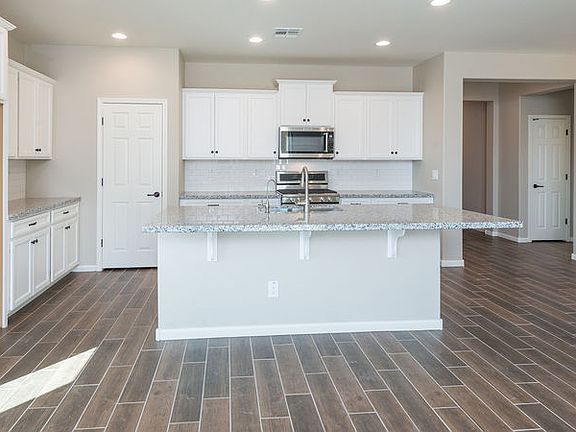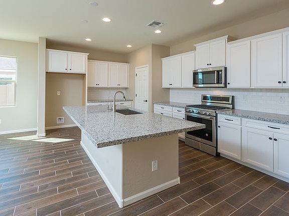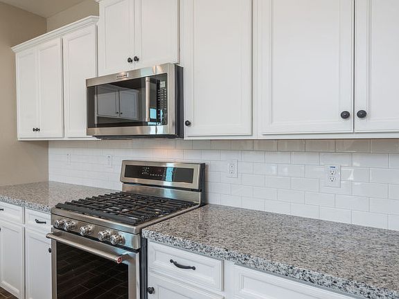 The open layout of this home provides a seamless flow between the kitchen, Great Room and dining room. Touches in this home include staggered cabinets in the kitchen, stainless steel appliances with a gas range, granite kitchen countertops and two-tone interior paint.