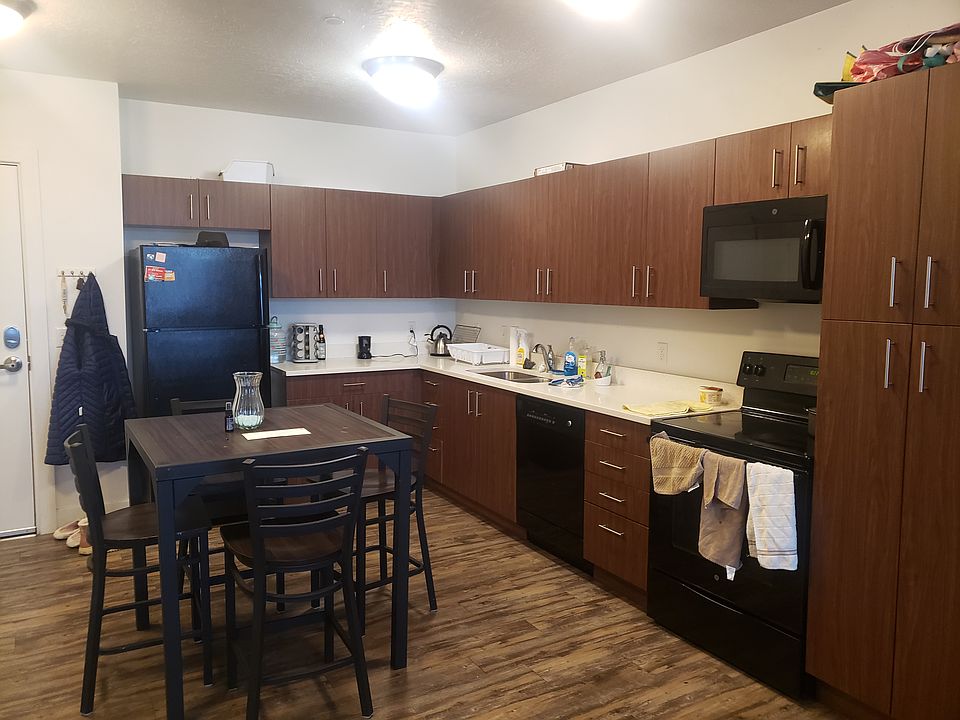 Private bedroom, shared bathroom at Promenade Place. Nice bedroom with large hanging space in closet. Furnished with bed, dresser and desk. Large shared laundry room with lots of storage space. Shared bathroom with one other person. Double vanity shared between all roommates. Plenty of space in the bathroom and vanity. Spacious shared kitchen and living room. Furnished with dining table, chairs, and seating. Living room has large window with sliding doors for a balcony feel, but is protected by a guard rail. Lease at Promenade Place. No smoking apartment. Primarily student housing, but not required to be a student to live here. Lease ends in July.