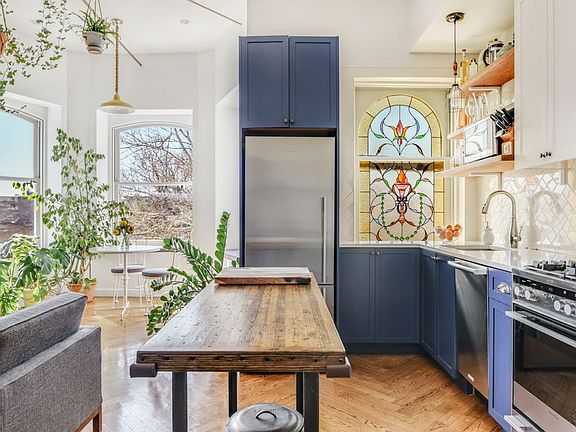Welcome home to 875 Saint Marks Avenue #3A, a stunningly gut renovated 1 BR/1 BA mint condition condominium. This rare, spacious home in a boutique 7 unit new development within a pre-war brownstone sits in the landmark district of historic Crown Heights, Brooklyn. Situated on a tranquil, tree-lined landmark block, this unique and exquisite condominium exudes the perfect mixture of pristine modern upgrades and sunlight along with incredible character and warmth. This top floor, sun-drenched, corner oasis offers soaring 11+ foot high ceilings, white oak herringbone floors, massive living and dining area which includes three large curved bay windows and custom window seating, original exposed brick walls, original beams and a decorative fireplace. Two skylights and 7 huge windows offer southern, eastern and western exposures which provide an abundance of natural light in each room all day long; you can watch the sun rise each morning and set each evening. A gorgeous open kitchen features an original restored stained glass window, white and blue custom shaker-style cabinetry accented with oil-rubbed bronze hardware, white Ceaserstone countertops and a top-of-the-line stainless steel appliance package including Bertazzoni range with Faber hood, Fisher-Paykel refrigerator and Electrolux dishwasher. The bedroom features a skylight, unique windows, exposed brick and a spacious closet. The bathroom includes a skylight as well as a deep soaking tub, wall-to-wall beveled white subway tiles, custom marble-top vanity and tiled floors with hand-painted designer pattern. Additional amenities include: Virtual Doorman, central A/C and heating, in unit LG washer/dryer. Crown Heights is home to a variety of fantastic shopping, recreation and dining options including Barboncino, Berg'n, BKW, Tinto, Calabria, Mayfield, King Tai, Colina Cuervo, Cafe Rue Dix and Punchline Juice Bar. Brower Park and the Brooklyn Children's Museum are directly across the street, while Prospect Park, the Brooklyn Botanic Garden, Brooklyn Museum and Brooklyn Public Library are only a short trip away. Convenient transportation is easily accessible by the A & C trains at Kingston-Throop Avenues, the 3 train at Kingston Avenue and the 4 train via Eastern Parkway, as well as several bus lines right outside your front door.
