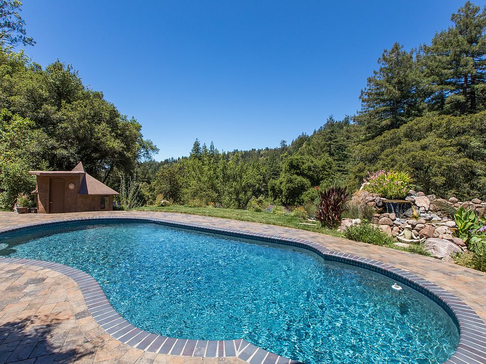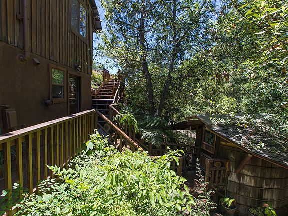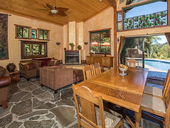 Behind the gated entrance, you'll find a gorgeous main home with a pool, hot tub & views of the nearby hills. Step inside & your eyes will be drawn across the great room to the vista beyond. The stone floors are heated from below to keep you warm & cozy. Your master suite has a sitting room overlooking the Koi pond & waterfall next to the hot tub. You can shower outside in the bathroom built into the redwood circle & then take care of your plants in the Victorian greenhouse. The second home is three levels of highly polished wood & views of the nearby trees. A small cabin provides an adventurous place for someone to spend the night or just hang out. There is so much here, that we will give you a map when you arrive so you can find your way around. Make sure you take the time to see it all. The bountiful artesian spring will give you plenty of water to drink, & irrigate, & the water tanks provide 35,000 gallons of on-site water storage.