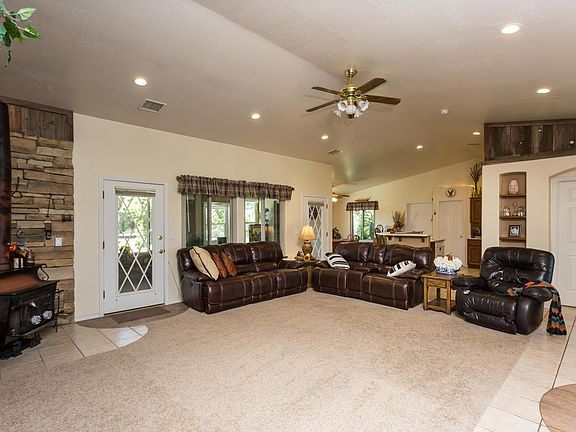 Welcome to your private retreat with a country feel, yet close to town. Enjoy peace and tranquility on the front porch complete with mountain views. Lush grass, numerous fruit trees (pears are ripe right now!) and grapes (owner has wine made from these grapes). Walk out to the 2400 sq ft insulated garage and shop that has ample space for your large motor home and toys; plus it even has a bathroom. The owners threw their wedding reception in this space. It's a dream come true for anyone looking for a large shop/workspace. Perimeter fenced; back yard is fenced for safety of your pets and children. This home is meticulously maintained and spotless! Come and check out your new home. It's waiting for you!