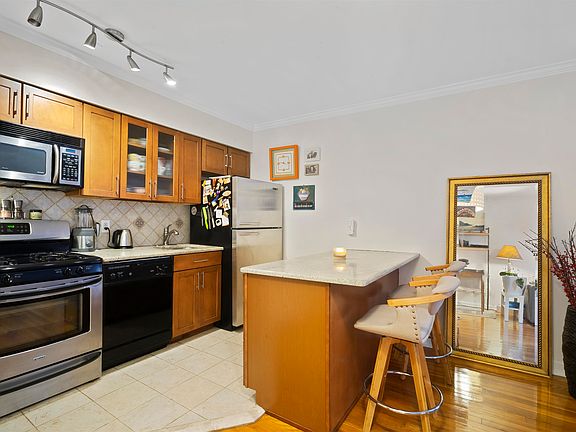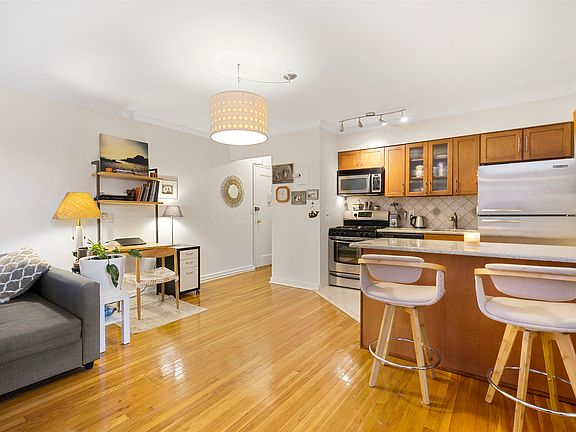 Woodcliff Gardens, a pet-friendly community only steps to NYC transportation is a renovated, spacious and immaculately maintained apartment featuring closets galore (5 large ones) right across from the famous Woodcliff Lake in the beautiful 167-acre Braddock Park. The kitchen features stainless steel appliances, granite countertops, wood cabinets and a breakfast bar opening into a large and flexible living/dining area perfect for entertaining with windows overlooking the park. The living space is so generous it can also fit a work from home office area. The bedroom is bright and airy, sizable enough to fit a king-sized bed plus other furniture with a wall of closets tricked out with shelving and organizers. The remodeled bathroom is neutrally tiled and like new. Fresh paint, crown molding, new doors and gleaming hardwood floors complete the package. It's move-in ready and what's better than having an escape into nature right across the street. You can go fishing, have a picnic, go off-leash at the dog run, enjoy the 45 sporting facilities (tennis, handball, soccer, etc.) or just walk the trails. Additional community amenities include an elevator, laundry room, on-site property manager, 24 hour supers, an outdoor pool and jacuzzi, and for an additional fee there is a community room for private events, an exercise room, storage bins and bike storage. Many bus lines run 24/7 or pop on the shuttle to the ferry.