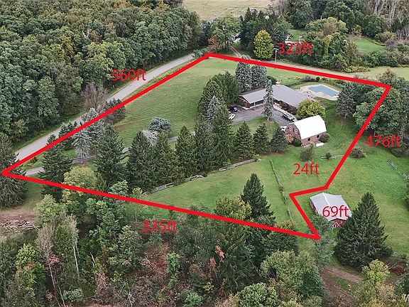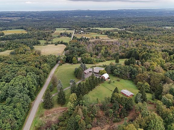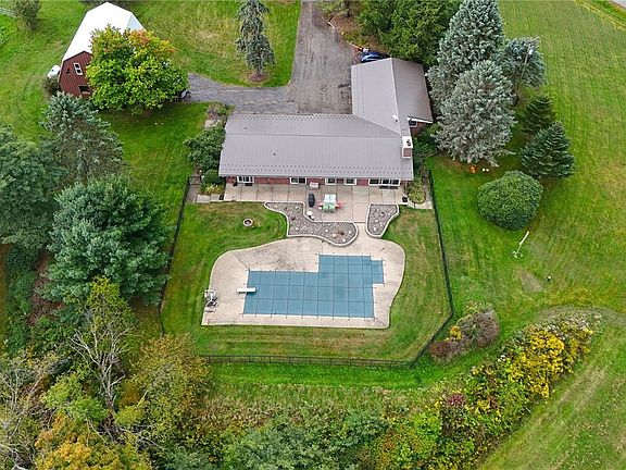 You will love this delightful country ranch with breathtaking panoramic views of Lake Erie on 4.40 acres! This 3152 sq. ft. spacious and open floor plan home boasts 4 bedrooms, 3.5 baths, 2 fireplaces, large 20x40 in-ground pool and a 3 car garage. The gourmet kitchen includes a Viking stove, double ovens, Corian countertops, plentiful cabinets and an additional full size pantry. The large master suite features lots of closet space, walk-in shower and a jacuzzi tub. A full walkout basement is finished with a fireplace, rec-room, bar, office/extra guest room, 1/2 bath and laundry room. Newer metal roof on both the home and beautiful 2 story barn with endless opportunities. This is an amazing hilltop home with so much privacy! Showings begin on 10/8.