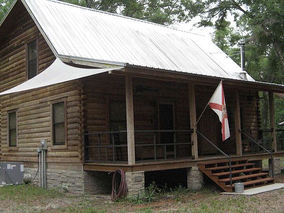 Unique two-story log cabin on 3.28 wooded acres for a peaceful, private setting within city limits of Fanning Springs, FL. The 3 BR, 2 BA cabin has metal roof, full length 8'x34' covered front porch, vaulted ceiling with upstairs loft overlooking family room with Saltillo Mexican tile floor, wood burning stove. Galley style kitchen has all Stainless appliances, custom tiled countertops, quality wood cabinetry. Extra features include 36x24 Workshop, 36x32 pole barn, 24x12 carport, 12x10 Tuff-Shed. Offers Welcome!