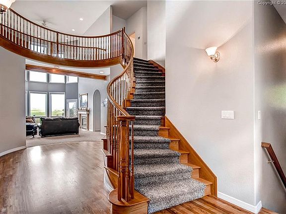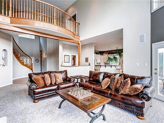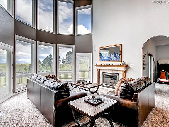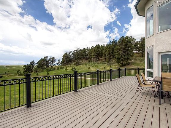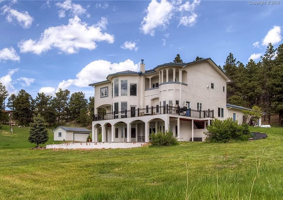 This custom home is proudly located on 69.5 acres of the most scenic land in El Paso County. The home is nestled amongst mature trees & rocky outcroppings with sweeping views of Pikes Peak & the Front Range. It even has its own 3.5 mile Frisbee golf course! Providing 4 bedrooms, 3 1/2 bathrooms, over-sized 3-car attached-garage, oversized 2.5-car detached-garage, theatre room (fully equipped), gourmet kitchen, architectural features & more, this home is second to none! Easy commute to Denver & North Springs. Walk in to a grand entry with stunning hardwood floors that flow throughout the main. The living room features lots of windows offering immense light, walkouts to the deck that runs the width of the house, gas fireplace & a wet bar. The kitchen features hardwood flooring w/double ovens, gas range, solid slab granite countertops, chic white cabinets, ss refrigerator, a nook perfectly tucked into the turret & an incredible walk-in pantry. The formal dining has coffered ceilings. The main is finished w/a family room, half bath, office, laundry & access to the oversized, finished 3-car garage! Upstairs features the master retreat, separated from 2 secondary beds via a catwalk overlooking the living room below. The master is spacious & provides a luxurious 5-piece bath & dream walk-in closet. The 2 secondary beds share a full bath on this floor; radial walls & new interior paint showcase this homes detail. Downstairs is a 4th bed and 4th bath. The downstairs family room & rec room share a 2nd wet bar & have space for exercising, game area, & more. The home is finished with a stellar theatre room completed by screen, projector, built-in speakers & ten theatre chairs w/elevated flooring! On this stunning acreage, a 2nd home can be built per El Paso County.