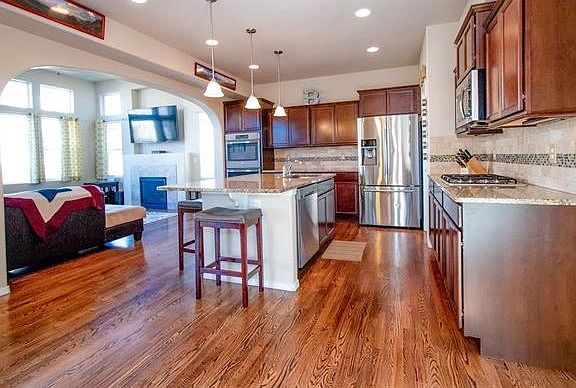 Immaculate and Spacious, this 3-year-old home has been lovingly maintained, looks BRAND NEW and has everything buyers are looking for! The open, bright, and the airy floor plan is perfect for entertaining. With SIX bedrooms, there is plenty of room for everyone and even a Home Office. This home welcomes in tons of natural light and feels welcoming and inviting. This home is a MUST SEE and is move-in ready! Living in Banning Lewis you are only minutes away from swimming pools, water parks, tennis courts, pickleball, miles of trails for walking, running and biking, summer concerts, farmers market events, workout facilities, and a luxurious ranch house. This home is nestled in a friendly and quiet Cul de sac with AMAZING neighbors. Incredible view of Pikes Peak from your front porch and many windows in the house. Gourmet kitchen and oversized island with GRANITE countertops and beautiful backsplash The finished basement and HUGE family room rounds out this home and is perfect for football Sundays! Custom-built Pergola over a huge stamped concrete back patio that is perfect for backyard entertaining. Fully Landscaped with beautiful trees and artificial turf in the backyard so it is very low maintenance.