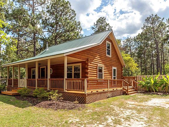 Adorable, solid-wood, log cabin, nestled on private lot, with approx 2 acres and sparkling inground, saltwater pool, which is completely privacy-fenced! Come home everyday to your own personal oasis! Log-home features a vintage ''Fisher Mama Bear'' wood stove, tile floors throughout main living level, updated kitchen and bathrooms, 1st floor master w/en-suite bath, double closets, upstairs 2nd bedroom, full bath and additional loft space that could easily be a 3rd bedroom (3-bd septic permit on file). Exterior has been freshly and professionally painted/stained. Property features a horseshoe drive, flowering azaleas, dogwood, crepe myrtle & hydrangea. Additionally, there is a chicken coop, pool shed w/electricity & covered storage, large wood shed, garden areas and 2 more outbuildings.