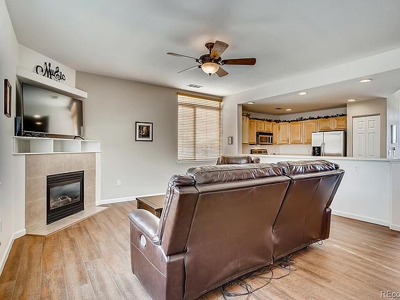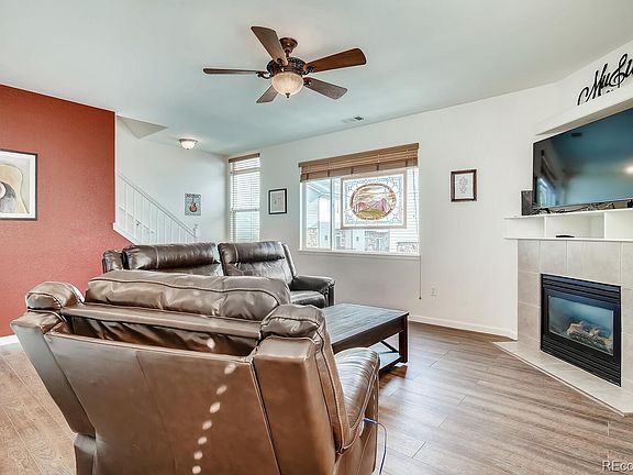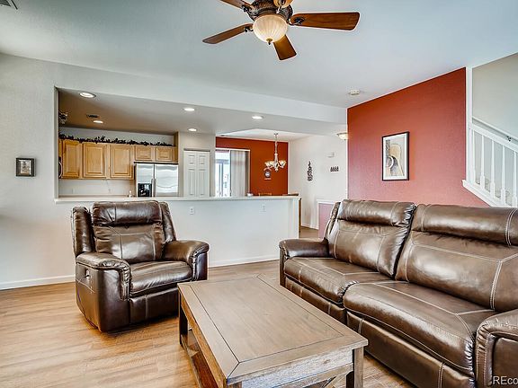 This turn-key condo lives like a townhome and truly has it all! This END UNIT has an oversized 2 car garage with direct access to the backyard area for those with 4 legged friends. The main level has an open floor plan from kitchen to dining and living rooms. The East -West orientation brings tons of natural light regardless of the time of day. Cuddle up next to the gas fireplace and enjoy Winter sunsets right out your windows. Convenient 1/2 bath on the main level and new flooring throughout this part of the home. The West facing balcony offers space for outdoor living and grilling with Mountain Views! Upstairs the well-appointed master suite has lots of room for a large bed, dresser and night stands. Attached master bath! The other 2 bedrooms share a bathroom in the hallway with easy to access laundry. Very manageable HOA of $225/month which covers water, sewer, trash, grounds maintenance. Easy access to I-25.