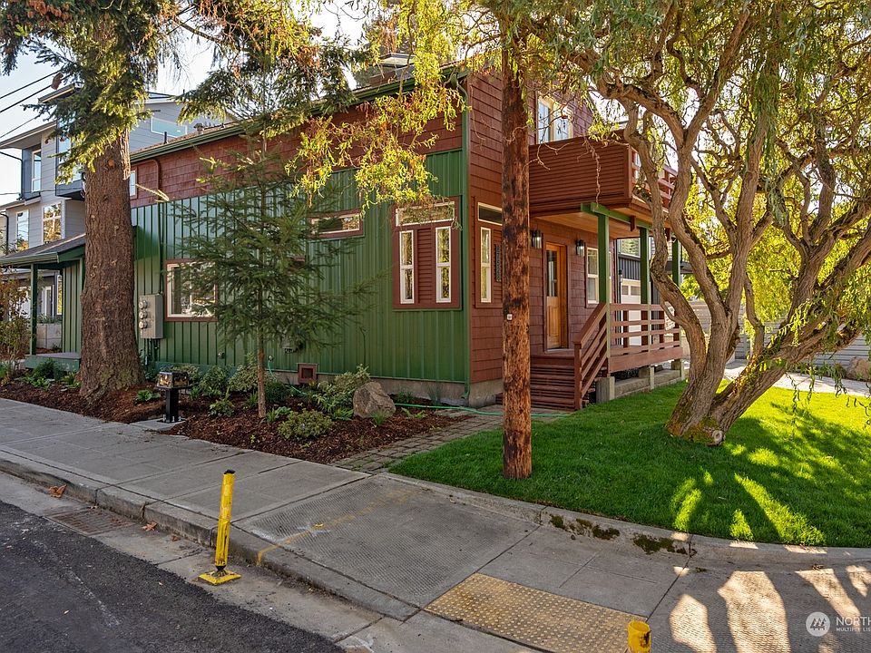 Historic charmer meets modern vibe. Remodeled two story corner home with wonderful light. Open floor plan with a large efficient new kitchen. This delightful home is part of a five homeowner's community. Two new bathrooms! Lofty primary suite upstairs plus additional bathroom on main floor for guests. Located on a quiet street. Convenient laundry area off back door which leads out to your private off-street parking pad. Close to restaurants, groceries, bakeries, coffee shops, library, parks and much more. The perfect in-city home! Turned off by large condo buildings? Must see to appreciate this home's unique appeal. Around the corner is one of Seattle's treasured lush neighborhood parks.