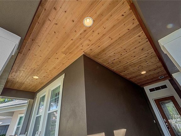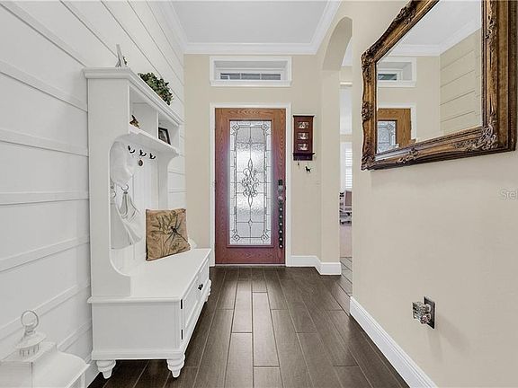 Welcome to this meticulously maintained 3 bed 2 bath Windermere home boasting 1,710 sf of living space, practically walking distance to Disney and shopping. The pavered driveway leads to the inviting front porch with a cedar paneled ceiling and an upgraded glass door entry. Inside you'll find a spacious and sunlit floorplan with designer finishes including crown molding and plantation shutters throughout, wood tile flooring, wainscoting, and accent wall paneling, arched entryways, and custom framed doors and windows. The living area opens to the gourmet kitchen featuring granite countertops, farmhouse sink, stainless steel appliances, pot filler and chef hood at the stove and pendant lights over the eat-in bar. The adjacent dining area overlooks the private backyard. Extend your entertainment to the fully screened and extended lanai with pavers and cedar ceiling for a luxurious feel and a beautiful conservation view with no rear neighbors. The master bedroom includes a tray ceiling and double crown molding, and a spa-like master bath with a dual sink vanity, frameless glass-enclosed shower with rain head and separate water closet. Additional bedrooms are large enough to easily accommodate friends and family. Disney fireworks can be watched nightly from your front porch. The exterior has been recently repainted. With the easy access to Disney, theme parks, shopping, dining, major roadways and the sought after Windermere schools, don't hesitate to call now to schedule your showing!