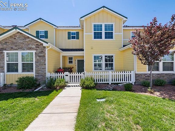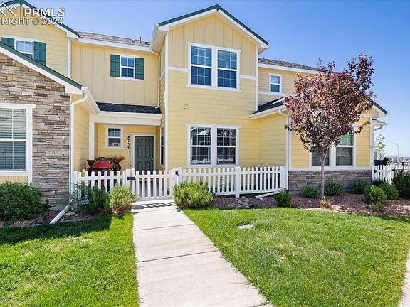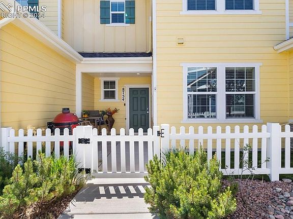 CHARMING 2BR, 3BA, updated townhome located in The Townes at Wolf Ranch. Private gated front patio to enjoy the Colorado sunshine. NEW CARPET, KITCHEN COUNTERTOPS AND BACKSPLASH, AND BATHROOM COUNTERTOPS INSTALLED IN 2024! Central Air and heat for year-round comfort. Light and bright open floor plan with 1363 sf of comfortable living space, a 9 foot ceiling, and luxury vinyl flooring on the main floor! This is a great area to entertain family and friends. The Living Rm includes a lighted ceiling fan and front yard views. The Dining Rm is located off the Kitchen for easy food service and clean up. The Island Kitchen features a pantry, counter bar, and upgraded cabinets with new quartz countertops and subway tile backsplash. Stainless steel appliances include a gas range oven, built-in microwave oven, dishwasher, and side by side refrigerator. Convenient main level Powder Bathroom. The Upper Level hosts 2BRs, 2BAs. a Loft, perfect for a home office or den, and a Laundry Rm with washer and dryer that stay, The Primary Bedroom is a private retreat that offers a walk-in closet and adjoining Full Bathroom with vanity and tiled tub/shower. The 2nd BR shares a Hall Shower Bathroom. 2 car attached garage with 220 volt electric car charge and door opener. Wolf Ranch amenities include a Rec Center (separate fee), parks, pool w/splash park, walking trails, playgrounds, a stocked lake, & summer concerts in the park. Conveniently located near highly rated D20 schools, entertainment, hospitals, and shopping, w/easy access to the Powers Corridor, Hwy 83, & I-25 for commuting to Denver & downtown Colorado Springs. Don't miss the opportunity to make this beautifully updated, move-in townhome your own where you and your family can create special memories for years to come!