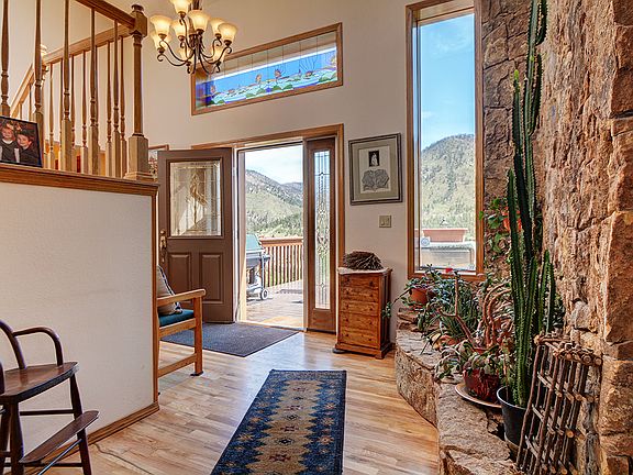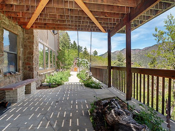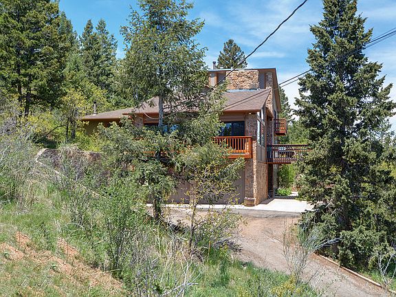 Beautiful custom built mountain home in desirable Cascade Colorado. Home was built by a European stone mason and is situated on the .90 acre lot to accentuate the gorgeous views. Floor to ceiling windows allow for expansive views from all areas of the home. The home features 4 stone/brick fireplaces, 3 decks and an out door living area with a custom made stone pizza oven. The elegantly hand crafted kitchen has a beautiful island and towering brick wall & large pantry. Formal dining room has a stone floor, wood burning stove and walks out the the back patio. Enormous living room has unobstructed views and beautiful stone fireplace. The lower level entertainment area features a wet bar, family room with another fireplace. Master bedroom on upper level has a walk in closet, 5 piece master bath and a private deck. The home has a secondary kitchen on the lower level. This is a must see!