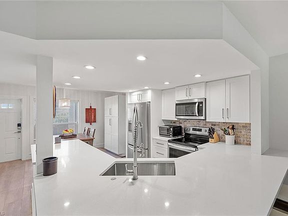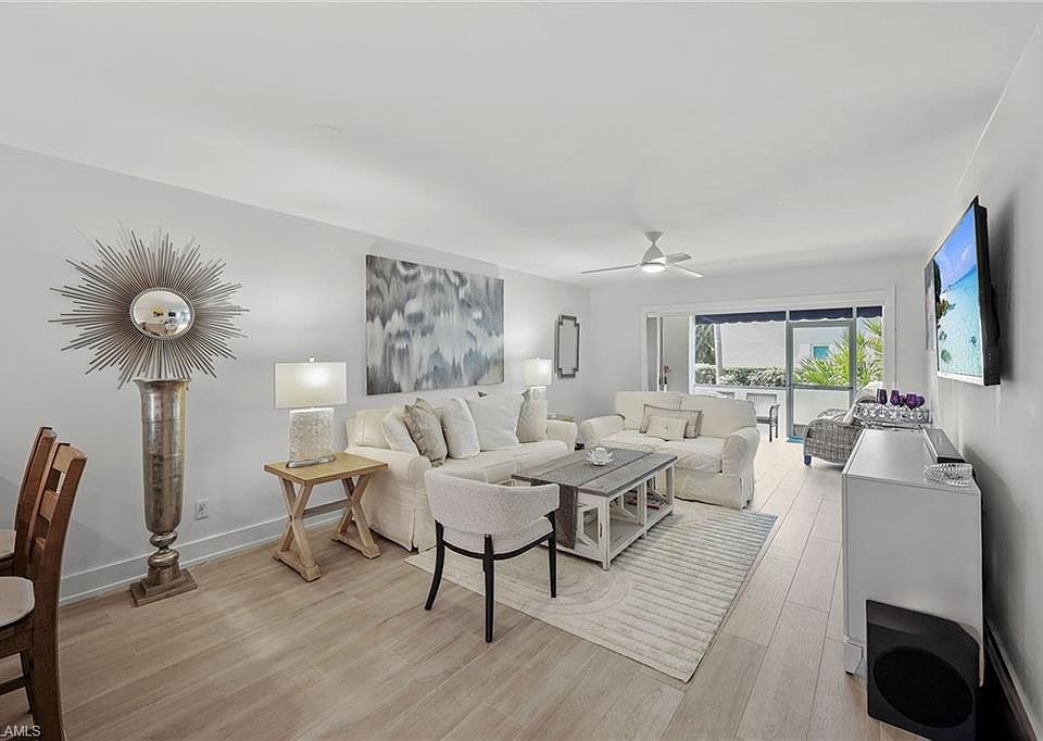 Completely remodeled and ideally located west of U.S. 41. This light-filled two-bedroom, two-bath home in the gated Pavilion Club offers upscale coastal living just blocks from Naples top shopping, dining and entertainment. The open-concept interior features plank tile flooring, white shaker cabinets, quartz countertops and stainless steel appliances. The spacious primary suite includes a walk-in closet, dual vanities and a glass-enclosed walk-in shower. Sliding doors from both the living room and primary bedroom lead to a screened lanai with an outdoor fireplace, overlooking a tropical setting. Enjoy unmatched walkability to Mercato, The Pavilion, Whole Foods, restaurants, movie theaters and a community park. Pavilion Club residents enjoy a community pool and private pedestrian gate to the Pavilion shopping center. Whether you're seeking a full-time residence, vacation getaway or investment opportunity, this home delivers luxury, location and low-maintenance living—all just minutes from the beach. No flooding during past storms, according to the owner.
