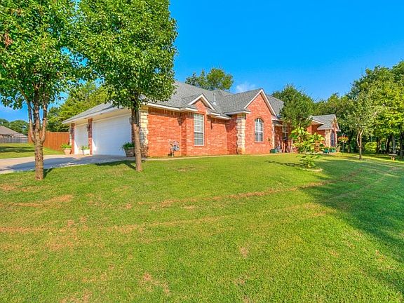 Beautiful home nestled on treed 1 acre with lovely open floor plan, great kitchen with Australian Walk through Pantry, near new Bosch Diswasher, new HW heater, master bath has large jetted tub, double vanities and separate shower, plus an Australian Walk through closet. Windows have 2' blinds on the west windows and Vertical blinds on the east windows. Nice laundry room adds to the many amenities of this spacioussplit plan with 3 bdrms, office or 4th bedroom, private fenced backyard, lots of beautiful trees! Home painted inside and out less than 2 years ago. Attached garage, 2 car portion has been beautifully converted into a large additional living room with heat and air, the 3rd car garage is available for parking and has a storm shelter in the floor. The 2 car garage could easily be converted back to a garage, but not needed with the 24x24 shop building. Driveway is right beside the neighbors driveway. Easy commute to Oklahoma City, Norman, Mustang, Blanchard and TAFB.