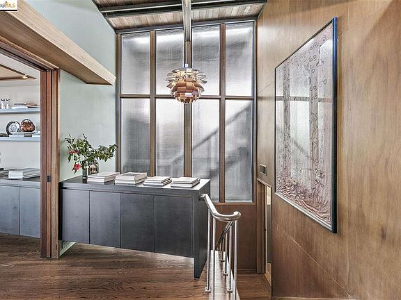 RATCLIFF MIDCENTURY MODERN. A stunning wood and glass open-plan residence designed by Robert Ratcliff oriented to take advantage of the verdant setting and panoramic bay views. Dramatic entry with tall windows highlighting the two story staircase to private bedroom level. Sophisticated living room and adjoining dining area with custom cabinetry, Asian inspired beam ceiling, recessed lighting, signature fireplace and views of the bay create the perfect setting for intimate gatherings or large parties. Sleek, eat-in kitchen has been remodeled with Poggenpohl cabinets, engineered stone counter, tile back splash and high-end appliances. Split-level down to a sound and video editing room with angled insulated walls to control acoustics and sound reflection. Adjacent storeroom would make a perfect wine cellar. Lower level with 3 bedrooms; master with fireplace and partial views. Tasteful Remodeled bath and access to yard. Bus to Downtown Berkeley BART, easy walk to Gourmet Ghetto.