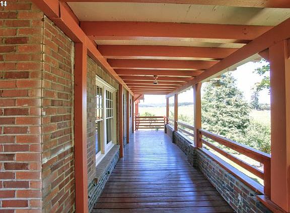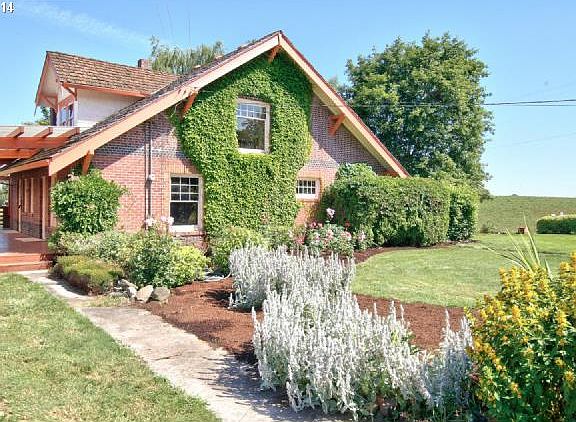 C.C. Perrine Craftsman bungalow brick home built around 1914. Beautiful wood floors, wood framed windows, unpainted wood trim & wood stairway & banisters. Great covered porches & patio to enjoy the rolling farmland! Huge 2 story barn w/6 stalls & 3 acres fenced pasture. Two car detached garage & a 3 stall outbuilding ,hardship permit required for residence or seller will remove mobile.