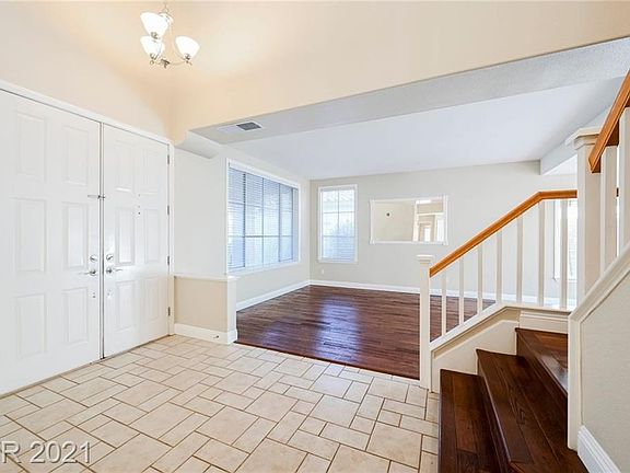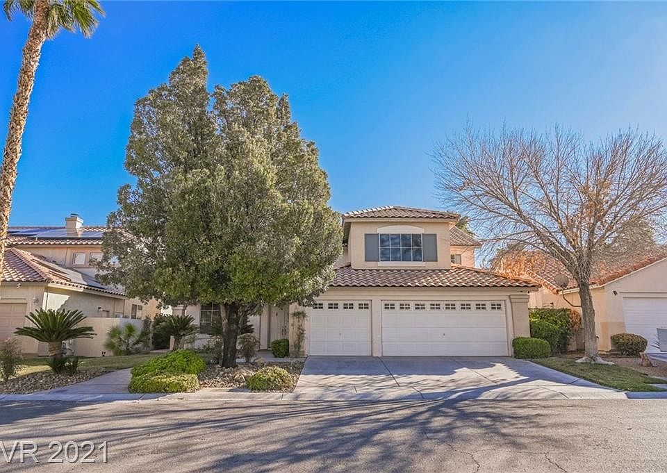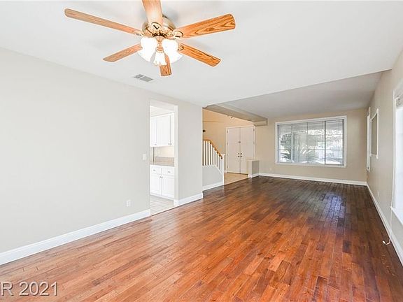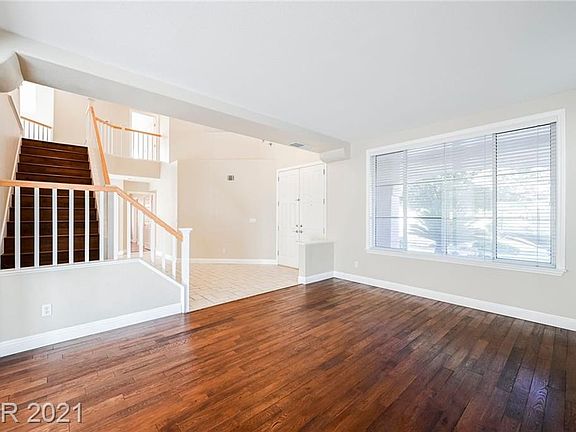 DREAM HOME! Beautiful 4 bedroom + den with pool/spa, 3-car garage. Hardwood & Ceramic flooring throughout. Sunny island kitchen with granite counters & breakfast nook looks out to back yard & opens to massive family room with vaulted ceiling, built-in bookcases & fireplace. Home schooling? Wait until you see the upstairs den with built-in desk, bulletin board & bookcase. Downstairs bedroom & full bath. Generous 17x14 primary bedroom with huge walk-in closet with custom built-ins. Primary bath has dual sinks, garden tub & walk-in shower. Ceiling fans in all bedrooms. Laundry room has wet sink & cabinets. Washer, Dryer & Refrigerator stay. Sparkling pool & spa with shade gazebo. EZ care low maintenance landscaping. Crystal Springs neighborhood offers EZ access to Strip & new Raiders Stadium. This is an amazing home offered by original owners.