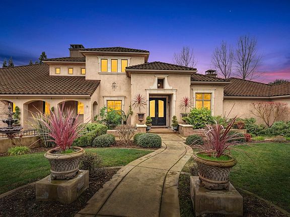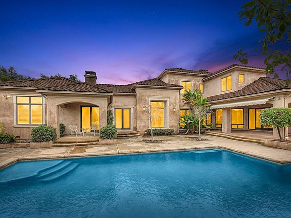 Private 1-acre parcel in gated cul de sac enclave, this remarkable custom estate is perfect for entertainment and relaxation. Outstanding floor plan includes great room with hardwood flooring; family room with wood beamed ceiling, fireplace, wet bar, wine refrigerator, and temperature controlled wine cellar. Dream kitchen features a large island with sink, custom cabinetry, pantry closet, fireplace, and high-end appliances, including built-in refrigerator and double oven. Nearby spacious bonus room offers a separate area for family and guest entertainment, and includes custom built-ins. All 4 bedrooms are en suite and offer generous space and privacy. Downstairs remote master suite with fireplace and luxurious bath includes a jetted tub, steam shower, heated tile flooring, separate vanities and walk-in closet. Private den features custom built-ins. Enjoy the resort-like backyard with pool and spa, water features, built-in barbecue, fireplace, plenty of patio space and lawn area.