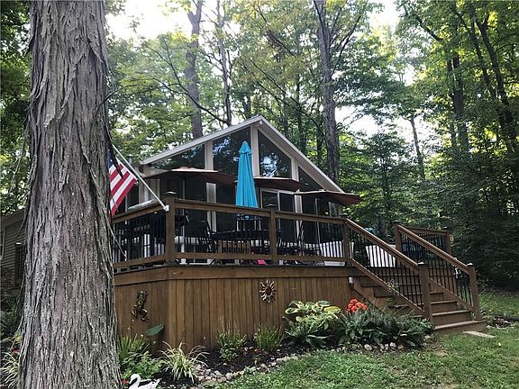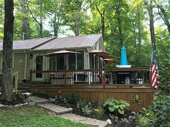 Charming 1 bedroom recently redone with new bead board and plush carpet. 1 full bath with stackable washer & dryer. Kitchen has hickory cabinets and granite countertops. Large windows open out to the awesome 4 Seasons Sun Room. There is a large wrap-a-round porch with 3 half umbrellas attached to the cabin for shade. The landscape has been updated and has many hostas, ferns & perineal flowers. There are 2 drive-ways for parking. Pontoon boat/floating dock stay. There are 2 sheds to store all of those lake toys. HVAC system is less than a year old. The sale includes a total of 4 lots. GreatWeekend get away or place to live. Side yard is to be final graded by perimeter drain company. All offers shall be submitted by Sunday at 5:00 PM.