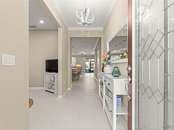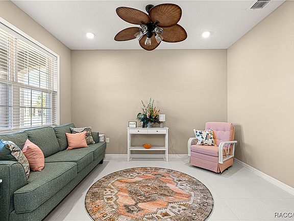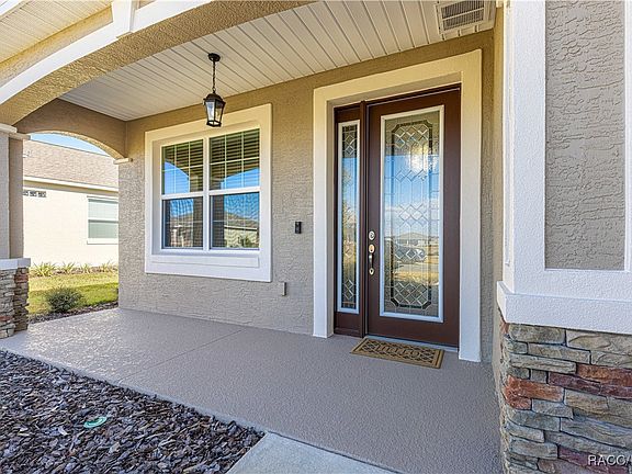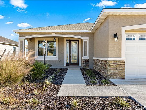 Available now! Orchid model, in the popular neighborhood of Weybourne Landing, part of the vibrant On Top of the World community. Built in 2023 this home features 3 bedrooms, a versatile flex room – perfect for a home office or hobby space, 2 bathrooms and a 2 car garage with an impressive amount of upgrades. The widened driveway, elegant stone accents, covered front porch and stylish glass-etched front door are the first of many upgrades you will see as you enter this home. On the inside, there is upgraded level 4 tile flooring throughout the main living areas, crown molding, tray ceilings, custom window casings, Levelor blinds, dimmer lights and ceilings fans. The open floor plan in this home provides the perfect setting for entertaining! The kitchen has a large center island with quartz countertops, glass mosaic backsplash, pendant lights, staggered cabinets with crown molding and Stainless Steel appliances. The primary bedroom has carpet, a tray ceiling and a large walk in closet. The ensuite bathroom has dual sinks, quartz countertops, chrome fixtures, linen closet, tile walk-in shower with seat, shower niche and a grab bar. The two guest bedrooms have carpet and convenient access to a full bathroom with quartz countertops and a tub/shower combo. The screen lanai has a 24”masonry wall in place for privacy and makes for an easy conversion to a sunroom. The inside laundry room includes the washer and gas dryer with cabinets for all your storage needs. The 4’ extended garage has a 24,000 BTU Daikin Mini Split for year round comfort, insulated door with windows, LED lighting, utility sink, water softener, painted floor and it includes the Golf Cart! Weybourne Landing offers a low HOA with an electronic gate system and incredible amenities including: clubhouse, pool, fitness studio, pickleball courts, miniature golf, dog park and more! Schedule your private tour today!
