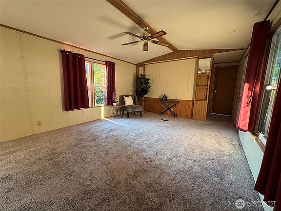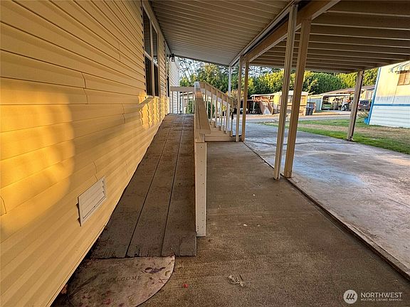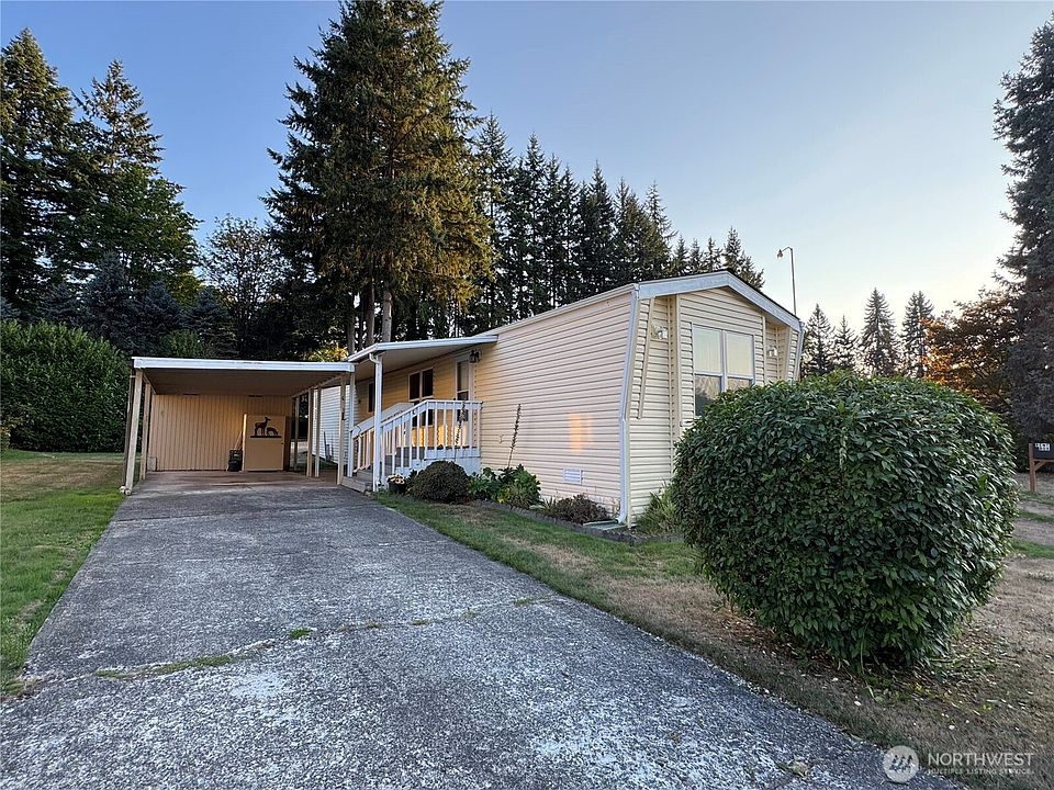 Welcome to Golden's Mobile Home Park. A small community with easy access to Bremerton, Silverdale, highways and more. This 1991 home offers ample space with 2 bedrooms, 2 bathrooms, an oversize living room space with so many options for lounging, relaxing or entertaining. End unit with loads of parking space in the driveway and covered carport. Ramp installed for easy access inside. Newer roof & gutters, newer - taller toilets, newer water heater & refrigerator. All appliances stay. Primary suite offers a soaking tub plus private walk in shower and commode. Second bedroom at the opposite end of the home offers privacy and connects to the second full bathroom. Shed for storage or tinkering. Park approval required.