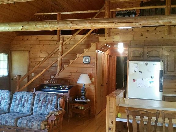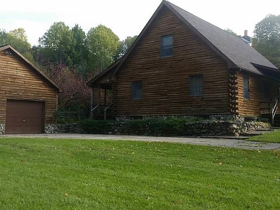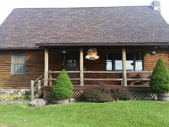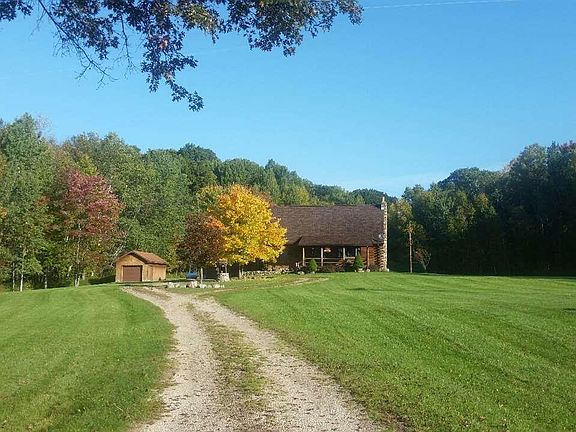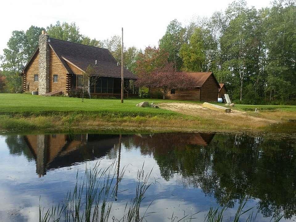 Log home on 13 acres with private pond, 2 garages, full basement, and screened porch. Features 3 spacious bedrooms, open floor plan with loft, natural hardwood floors, and custom woodwork throughout.