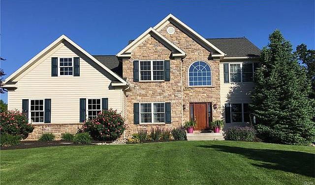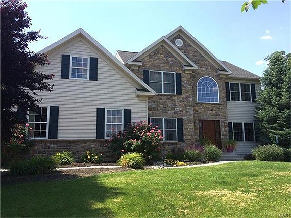 Impressive façade with lots of architectural curb appeal on this 2979 sq ft Hoffman-built colonial in Valley West Estates. Extra-special fabulous fenced back yard is ideal for gardening, recreation or quiet enjoyment. It is long enough for a regulation football field and wide enough for tennis courts and a putting green. Nobody offers lots like this with public utilities anymore. The floor plan includes an office, deluxe master suite with 2 walk in closets, and an oversized garage. Finished Daylight basement has good ceiling height and windows, has a dry bar with custom cabinetry, gas fireplace, and a full bath. Natural gas heating system, built in humidifier, Tyvek house wrap, 5 ceiling fans and Andersen windows make for low energy costs. This is a very attractive floor plan in one of the nicest neighborhoods in the Western Lehigh Valley.