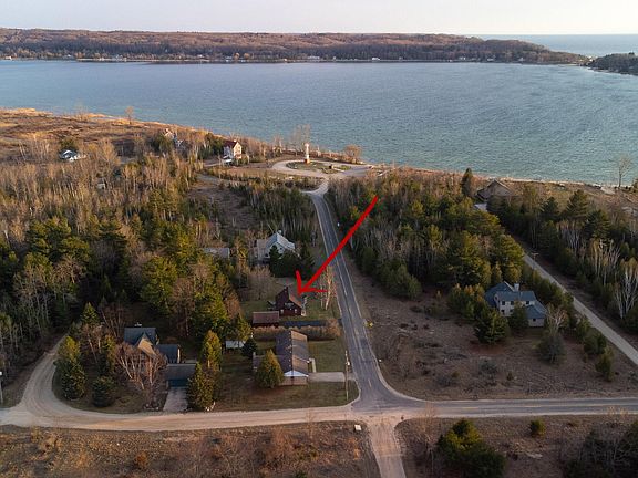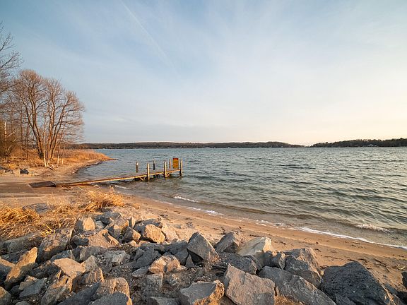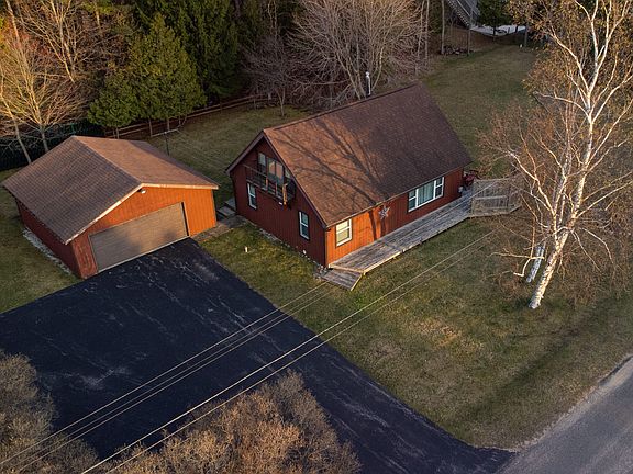 A rare location opportunity in this beautifully updated, insulated getaway w/2 car garage, paved driveway, parking area and great yard! An exceptional Portage Lake access just a 2 minute walk away provides a sandy swimming beach, dock and kayak/ boat launch. Exterior doors and windows are all replaced. In 2022, improvements included the opening up and remodel of main floor living area, new hickory kitchen, new bathroom, new natural gas freestanding fireplace w/thermostat and the crawlspace cleaned and sealed. New wood flooring just installed! 2 bedrooms on main floor with a 3rd bedroom and large bunkroom upstairs. Septic system new in 2015, water softener in 2020. Enjoy the 80 acre trail park across street, deck and large firepit area. Use for yourself or make an amazing vacation rental!