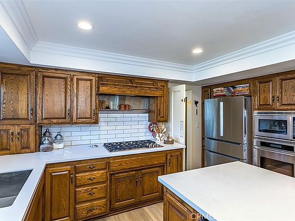 This corner-lot home is spacious & versatile & located in the Los Coyotes Country Club area, offering numerous features & ample opportunities. Here are the key details: Situated @ 1/4 mile from LCCC, it falls within the FJUSD, allowing students to choose their high school (buyer to verify). The home boasts a generous living space of nearly 4,500 sq ft with a lot size just shy of 25,000 sq ft. It comprises 5 bedrooms (3 upstairs and 2 downstairs). Additionally, there are 3.5 bathrooms to accommodate the household's needs. The home is filled with natural light, thanks to the abundance of windows. As you enter, you'll find a welcoming & well-sized entryway. The large living room features a fireplace & picture window looking out to the backyard. One bedroom, currently used as an office, includes built-ins (title shows 4 bedrooms, but this has a closet). The ceilings have been scraped for a smooth appearance. A formal dining room with plenty of windows & an elegant chandelier adds to the charm of the home. The lower level includes a master bedroom suite with a ceiling fan & mirrored wardrobe doors. On the 2nd level, there is another master bedroom suite with a balcony, ceiling fan, large jetted tub, dual sinks, adtl mirrored wardrobe closets in the bathroom, small refrigerator & location for a TV. The kitchen has been updated & features modern amenities incl a large farmhouse sink, stainless steel Bosch dishwasher, 5-burner Wolfe stove with a Thermador vent hood, Dacor oven & microwave, quartz countertops with subway tile backsplash, trash compactor, stainless steel Bosch 4-door refrigerator, walk-in pantry, island, built-in seating & bay window. Adjacent to the kitchen, there is a spacious family room & a laundry area equipped with a washer/dryer & adtl Bosch refrigerator (included). The backyard is ideal for entertaining guests with its beautiful landscaping & various amenities. It offers plenty of greenery & shade, pool/spa equipped with Pentair programmable pumps, multiple levels of patio areas for seating, fire pit & more. This home also features vinyl fencing & a huge driveway with RV parking potential. Adtly, there is a 3-car garage & extra garage with pull-through door which could accommodate RV parking or possibly be converted into an ADU. The home includes other notable features such as tile roof, front/back landscaping & an office off the garage (not pictured) that provides approx 450 square feet of additional space not included in sq footage.
