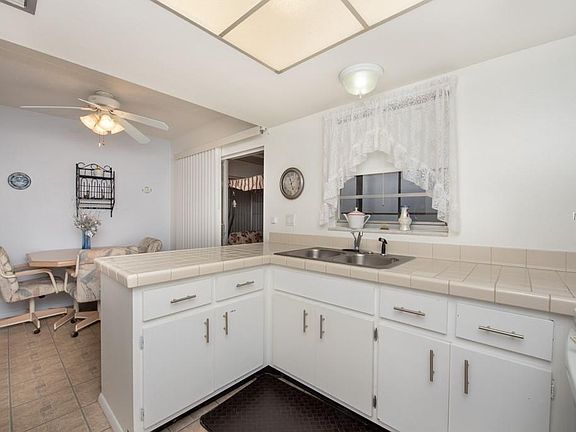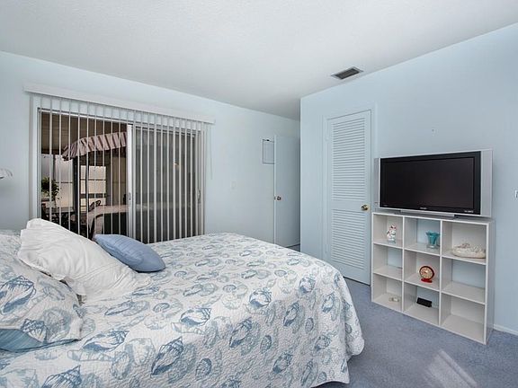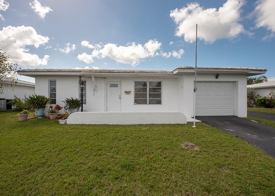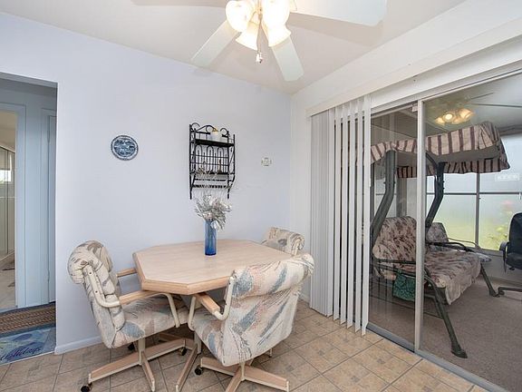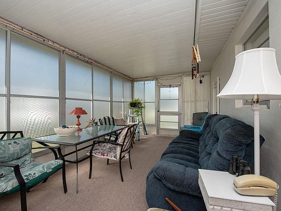 Welcome to this charming 2 bedroom 1 1/2 bath block home situated on a corner lot on a private street. Great curb appeal with a quaint covered front porch to greet your neighbors. Clean, bright & well maintained open floor plan invite you in to the carpeted living room. Great kitchen with tile counter tops top, plenty of cabinets, deep sink, window overlooking yard and breakfast bar open to the brunch area which offers sliders leading out to the spacious screened lanai and tidy yard to enjoy the Florida weather. Roomy master bedroom boasts a walk-in closet and sliders to the back and updated bath with walk in shower. Guest bedroom is bright and offers ample space and convenient jack and Jill 1/2 bath. There is a 1 car garage with washer/dryer that stay in home and door leading outside. Furniture is optional so you could literately move right in! 55+ community has amenities and is close to restaurants, shopping, churches, public transportation, beaches, golf course and post office. Would make a great retirement home or winter retreat!