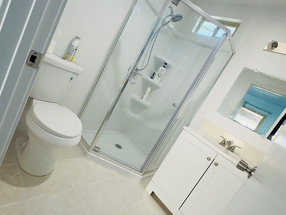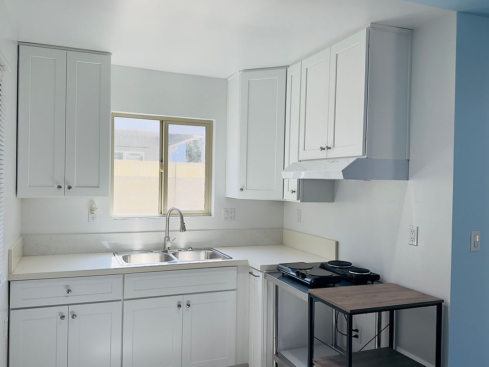 new house (ADU) built on corner lot; kitchen, dining, frig ...