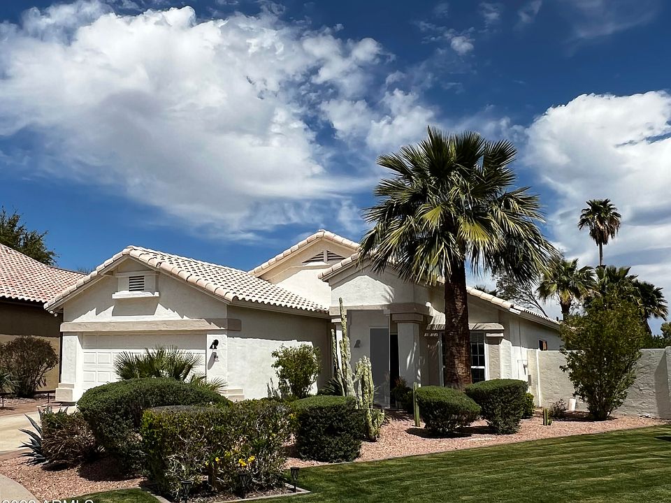 Beautiful North Scottsdale home! Single level, split floorplan with living room and family room as well as den. The roomy interior offers vaulted ceilings, and the entire interior and exterior was painted in 2022! No carpet in this home, just beautiful tile flooring throughout. The kitchen includes all-new 2023 stainless appliances, custom cabinets, granite counters, RO water system and a center island w/raised breakfast bar. In 2017 all windows were replaced. Newer water heater. Kinetico water system. The spacious primary bedroom features a large walk-in closet and a soothing spa-like bath with garden tub, a separate shower and dual sink vanity. Nestled on a huge corner lot, it features a covered patio, professional landscaping including built-in grill, fire pit, and artificial turf. A raised herb and vegetable garden add beauty and convenience to your new home. North/South orientation. Move-in ready!