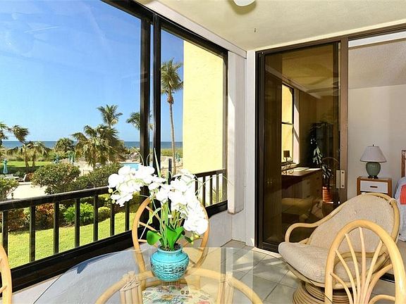 BEACH AND BOAT DOCKS! BEAUTIFUL VIEWS! This residence boasts views of the Beach and the Gulf of Mexico from the kitchen, living/dining room, master bedroom and screened and glassed-in lanai. Island Reef is a very special, well-kept secret on the south end of Siesta Key and one of the few true Gulf to Bay communities. This Eleuthera floor plan residence is turnkey furnished and offers an interior utility room with laundry in residence. End Unit make this home light and bright. Features include: updated kitchen with white cabinets, stainless steel appliances and extended solid surface countertop to include eating bar; assigned carport and guest parking. Every day is like a vacation with two heated pools, three lighted tennis courts, pickleball, billiards, remodeled fitness room, remodeled clubhouse, boat docks with lifts allowed, BBQ patios, bike storage, kayak racks, saunas, remodeled Gulf side social room, Wi-Fi and more. PET FRIENDLY. Meet new friends with the active social calendar. Just a short stroll to three of Siesta Key's favorite restaurants or ride the Siesta Key Trolly to Siesta Key Village. Enjoy maintenance-free living with the joy of being close to all the cultural activities Sarasota has to offer.