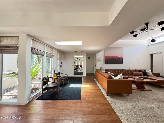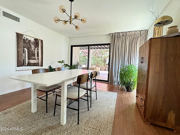 Experience mid-century modern luxury in this stunning home located in the heart of McCormick Ranch. Every detail in this residence has been thoughtfully curated, with no expense spared. The home boasts custom tile and bath fixtures by Waterworks, seamlessly blending with the original mid-century architectural design to maintain its vintage charm. This light-filled corner unit offers the ultimate in privacy, with no shared walls, ample storage, and a private two-car attached carport. The peaceful and private backyard, complete with low-maintenance landscaping, is perfect for enjoying Arizona's beautiful weather. Inside, the living room features a vaulted ceiling and a cozy fireplace, creating an inviting and spacious atmosphere.Enjoy all Spring Training games from just down the street.