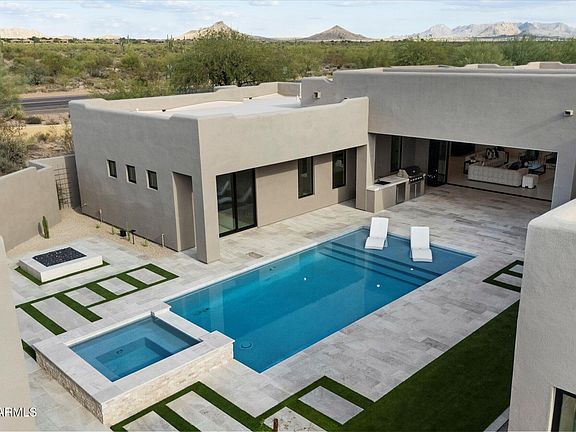 Heated pool and spaEpoxy floorsSleek fireplacePrivate en-suite bathMcdowell mountainsElevated roof deckMassive quartzite island
