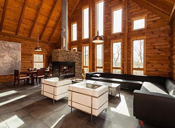 Contemporary A-Frame Log Cabin with privacy and winter views. Slate tile floors throughout the main level, 25 ft soaring ceilings, 3-way wood fireplace in great room, open chef's kitchen, tons of windows and sunlight, bonus room on lower level (currently a home theatre room), unfinished room/storage on lower level, lower level garage, fenced in side yard, metal roof, 2.5 acres of woods, move-in ready!