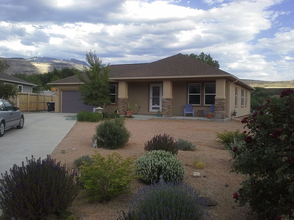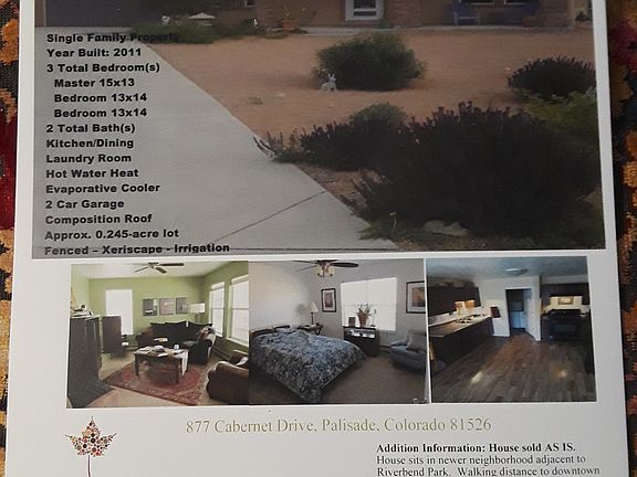 Google street view is inaccurate. House to right repainted green with xeriscape, lot to left with gray house. There are three large bedrooms to accommodate a growing family or co-housing for Seniors. Two full baths, and two car garage. There is an enclosed porch off of back. There are fruit trees in back yard - peach, cherry, and apple. Walking distance to downtown Palisade as well as Taylor Elementary school. Palisade population is 2,500 with Grand Junction twelve miles away. Palisade is known for their peach orchards as well as their vineyards. The views include the Bookcliffs as well as the Grand Mesa. The rear of the property overlooks Riverbend Park with the Colorado River to the south. Neighborhood is well kept and quiet. FSBO 307-760-5669