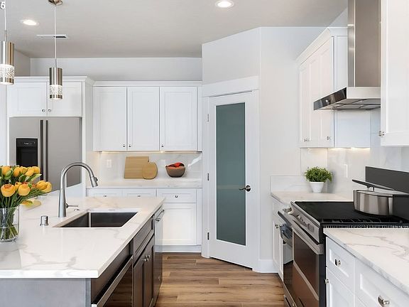 - Quartz, Vaulted Ceiling(s), Kitchen Island, Pantry