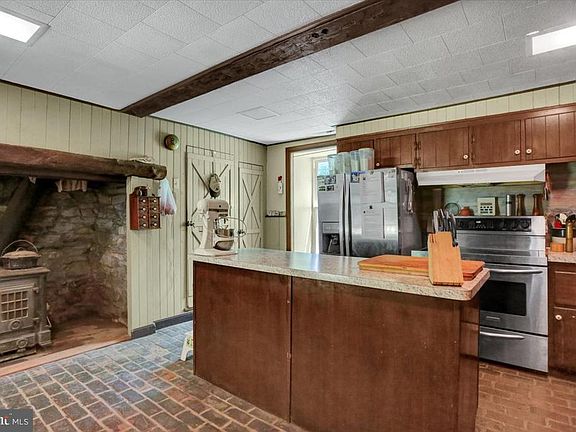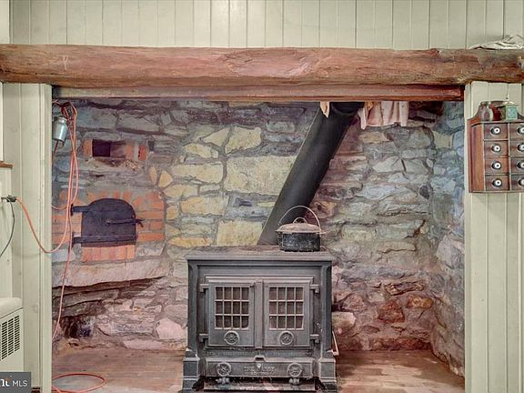 1790 Stone Farmhouse on 10 Acres. Peacefully located down a private drive, surrounded by mature trees you will find this beautiful 4000 sq. ft. stone farmhouse with multiple outbuildings. Open airy kitchen with stainless appliances, island for extra space & brick flooring. Focal point in the kitchen is the walk-in stone fireplace. Wide hallways leading to the large living room and dining room with exposed wooden beams, wide plank flooring and stone fireplaces. Gathering is the family room will be a dream with over 500 sq. ft. of space, tons of natural light, exposed stone wall, brick fireplace & wet bar. Conveniently located on the first floor is the laundry room and a full bath. All newer windows on the first floor with beautiful deep window sills. There are dual staircases that lead to the second floor. On the second level are 4 bedrooms & a full bath. All four bedrooms are nice sized rooms with closets and 3 bedrooms have fireplaces. There is a finished attic room off the kitchen which could have multiple purposes. Home is secluded by many acres of farmland. You are in your own oasis surrounded by flat, usable land & trees boarding. There are pear, peach and apple trees on the property. Several outbuildings. Large story barn for animals, garage space, workshop... endless possibilities. Short commute to major routes. You are tucked back off of Rt 222 just minutes from Rt 78. Property is in Clean & Green with very low taxes.
