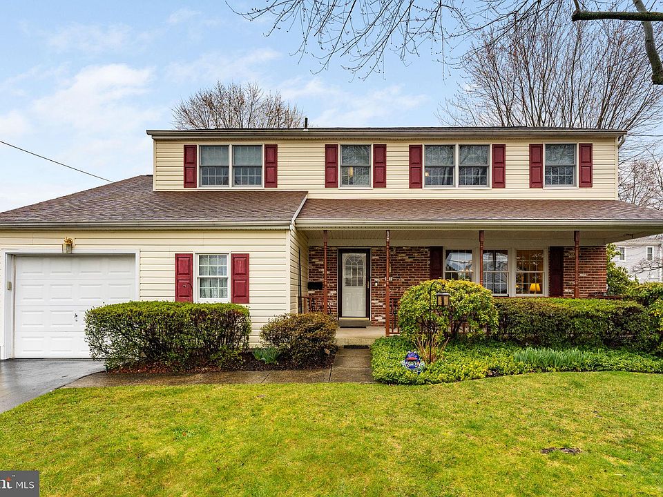Welcome home to this beautiful well maintained home featuring 5 bedrooms, 3.5 baths, hardwood floors through-out, and a partially finished basement with plenty of room for storage. A shaded front porch provides a welcoming entrance and a peaceful spot to relax outdoors, especially during warmer months. It's a wonderful extension of the living space and adds to the overall charm and curb appeal of the property. Homeowners and guests alike can enjoy the serenity and natural beauty offered by the trees while sitting on the porch. It's an excellent space for enjoying morning coffee, reading a book, or simply taking in the sights and sounds of the neighborhood. Entering the center hall foyer, the large living room is to the right. The adjoining dining room features a large bay window with a wide windowsill to showcase your plants or collectables. Through the dining room, you enter the bright updated eat-in kitchen with quartz counter tops and another large bay window. From the kitchen, step down one step into the cozy family room with a functioning gas fire place and another large bay window giving plenty of light and offering views to the lush gardens in the partially fenced backyard. Off the family room are a laundry room/ mud room, a half bath, and an attached 1.5 car garage. Upstairs, there are five good size bedrooms, two with en-suite bathrooms, 3 additional bedrooms and a hall bath. The primary bedroom also has a walk-in closet and en-suite bath. There is a second primary bedroom with en-suite bath, as well. Beneath the carpeting upstairs is hardwood flooring.