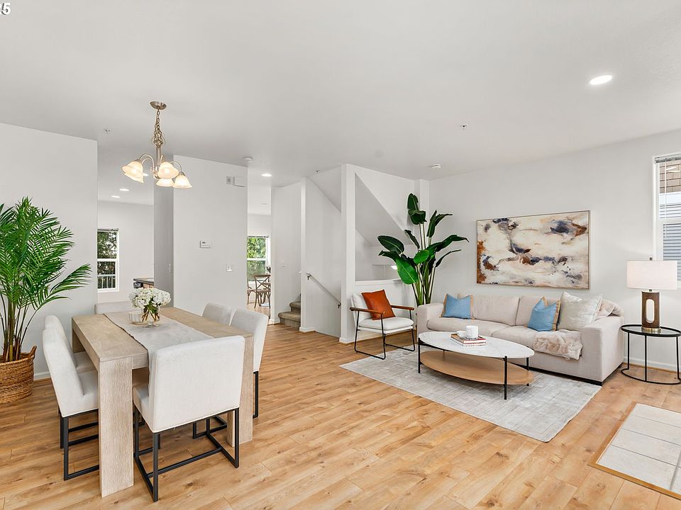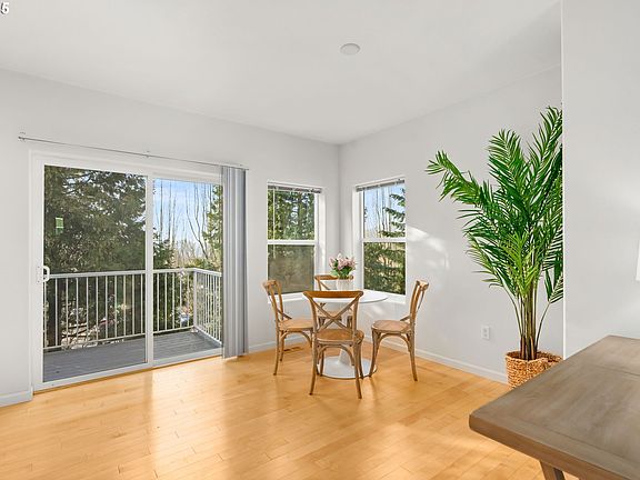 Step into this beautifully maintained 3-bedroom, 2.5-bath end-unit townhome nestled in the Sexton Mountain neighborhood. The cozy living space, anchored by a gas fireplace, is filled with abundant natural light and showcases beautiful new flooring, creating a warm and inviting atmosphere. The open-concept layout features a spacious kitchen with stainless steel appliances, a pantry, and a charming eating nook. A sliding glass door opens to a private balcony, the perfect spot for morning coffee or evening sunsets. The upper level includes a primary suite that offers a dual-sink vanity and a walk-in closet, while two additional bedrooms provide flexible options for a guest room or home office. Additional features include a new water heater, two balconies, and an oversized 2-car garage with extra space, ideal for storage or a home gym. This end-unit townhome is located in the Beaverton School District and combines comfort with practical functionality. Enjoy living in a vibrant community with easy access to local shops, restaurants, and parks.