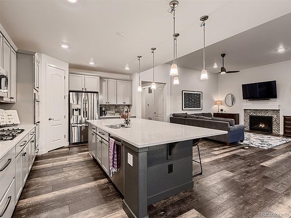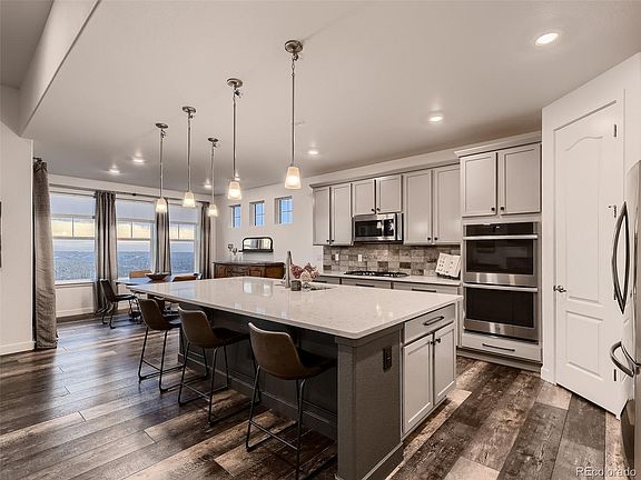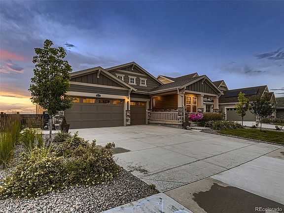 INSTANT EQUITY OPPORTUNITY- Back on market! Come sit back, relax and enjoy the stunning mountain views in this turn key home with a custom in-law suite! Walking in you are greeted by nine foot ceilings and wall to wall windows across the back of the home where you can soak up the mountain view in every room! Enjoy the kitchen's oversized granite countertop, walk-in pantry, and ample cabinet storage. The primary bedroom features dual sinks, an oversized shower, expansive walk in closet, and 11' ceiling inlays. There are two office spaces on the main level as well as an additional bedroom with a private bathroom. Upon entry to the walk out basement with private access, you are greeted again with wall to walk windows to soak in the Colorado sunset. This space features a full custom kitchen, custom living room cabinetry, room for dining, large bedroom, bonus space, and large bathroom. There is ample storage in the basement with an additional laundry hookup! Relax in the backyard to sounds of a custom water feature, warming up to next to the stone gas firepit and expansive patio addition. Just a short walk to the neighborhood pool, multiple parks, outdoor entertainment ares with grills and covered patios, pickle ball courts, trails, tennis courts, and dog park this is a home you want to see!  Custom features include:  Custom cabinets in the mudroom, laundry room, basement kitchen and basement living room. Motorized sun shades off upper patio, sun shade on lower patio, custom gas fire pit and stonewall seating, fountain in backyard, secondary laundry in basement, finished garage floors and custom hanging rack, and security storm door at main entrance.