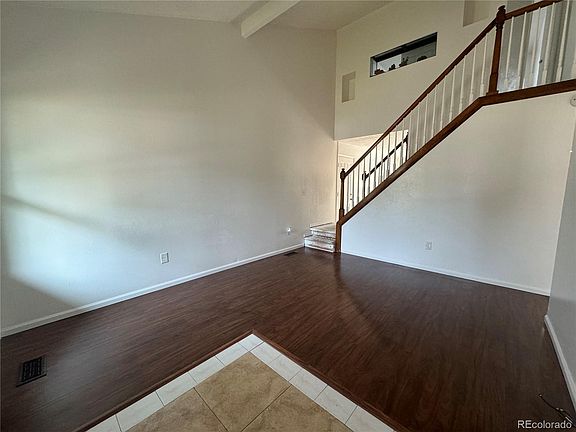Step into the vaulted living room, where laminate flooring meets an elegant tile inset, creating a stylish yet practical living area. A standout feature is the unique built-in aquarium in an upper bedroom, adding a dynamic visual element visible from the living room, enhancing the home’s open and airy feel.