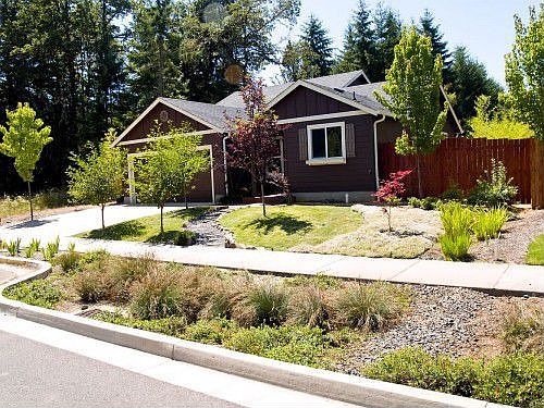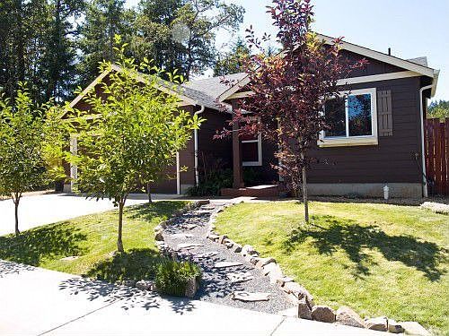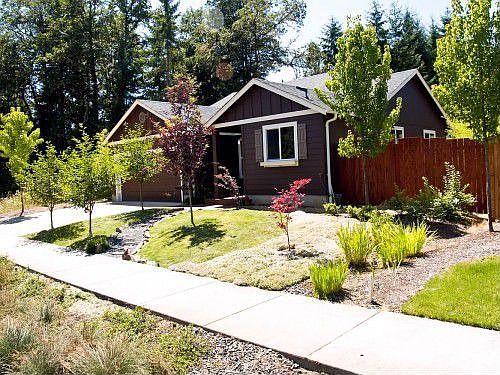 Complete info: http://87752oaksorchard.IsNowForSale.com - Enjoy the vaulted ceilings and designer colors in this popular floor plan with 1304 square foot, 3 bed 2 bath featuring kitchen cabinet and backsplash upgrades. Additional upgrades include beautiful frosted glass closet doors and custom interior window trim treatments. Smart design puts the bedrooms at the back of the home and 2 car garage up front. End of the road corner lot location ensures privacy and quiet. The neighboring property to the rear is an undeveloped meadow, creating a wonderful sense of open space and tranquility. The covered front porch features custom stained concrete and cool fern garden. Just to the left, the two car garage with room for parking two cars in driveway as well. The front yard features thoughtful landscaping with curving stone and gravel path, lush easy care lawn, attractive ground cover plantings, 3 Montmorency cherry trees, and 8 blueberry bushes. Walk through the north gate into the back yard, winding around custom raised garden beds and lush plantings. Cross the dry stream bed to the tumbled paver patio and enjoy the expansive open field stretching up the hill without another house in sight. The back yard also features extensive edible plantings, including two varieties of raspberries, grapes, josta berry, red currant, more blueberries, pear tree, and strawberries. The back patio, off the living room features custom stained concrete and a modular greenhouse/solarium for gardening, or enjoying a warm exterior space on cool days. This home is truly move-in ready, and lightly furnished so it is easy to get a feel for the space and how you can put your personal stamp on it. Call your agent for a private showing or call 541-225-8081 for more information.