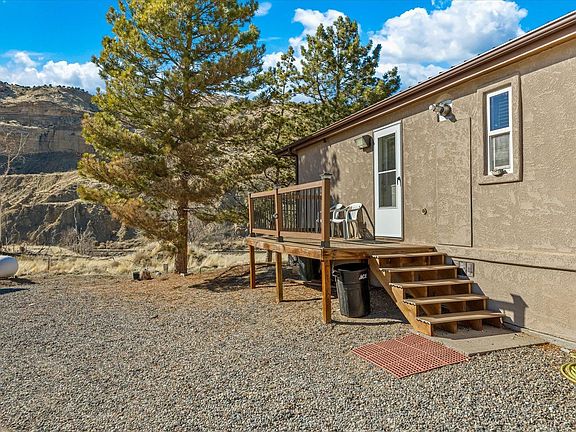 Nestled on 6.4 acres of rolling picturesque land, this property is your canvas for vineyard dreams or fruitful orchard endeavors. With a touch of care and attention, this former orchard, which once boasted two serene ponds, awaits its revival. The manufactured home, partially updated in 2014, features a sturdy metal roof and inviting stucco siding. Embrace gatherings in the open kitchen and dining area, where memories are made over shared meals. Relax in the spacious living room, complete with a comforting pellet stove, ideal for chilly Colorado evenings or marvel at the views of DeBeque Canyon and the local wildlife from one of two decks. The generous primary suite offers a tranquil escape from the everyday hustle and with a new on-demand hot water heater, your comfort is never compromised. Discover the charm of three distinctive outbuildings on the property. A small, weathered canal wood barn adds rustic character, while a two-room cement block building beckons as an inspiring artist studio or simply additional storage. And you can’t miss the expansive 60x30 detached two-car garage, boasting a workshop area and equipped with a pellet stove for year-round comfort. Don't miss the opportunity to craft your own haven amidst the splendor of Palisade, where possibilities are as vast as the land itself. Welcome home to serenity, potential, and the essence of Colorado living!