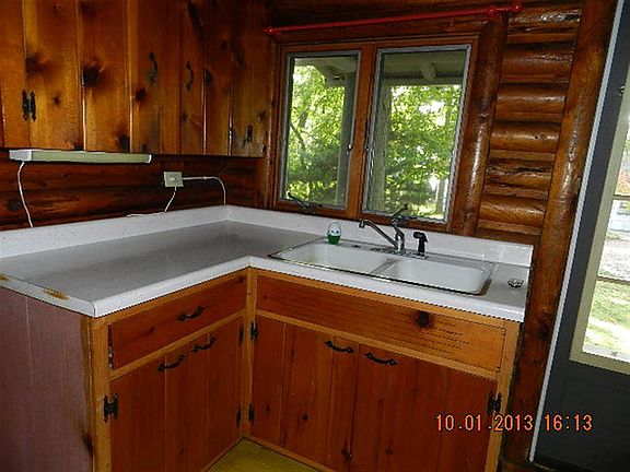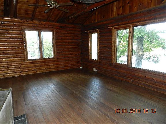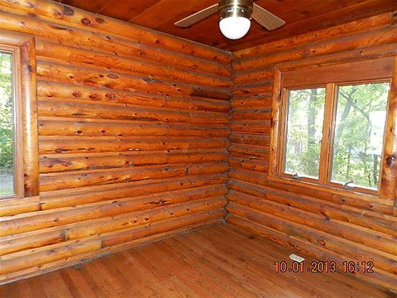 Cozy lakefront log cabin. 3 bedroom, 2 bath. Great room with exposed log beams, stone fireplace, and wall to wall windows afford a panoramic view of the lake. Vintage knotty pine theme throughout upper level provides warm contrast to the recently updated lower level. Master's en suite includes dressing area and walk-in closet. Walk out lower level includes 2nd fireplace, theater room and finished laundry room. The home sits on a wooded 1/3 acre with 240 feet of lake frontage. Additional lot across the street provides another 1/4 acre for storage, parking, and additional pier space on canal.