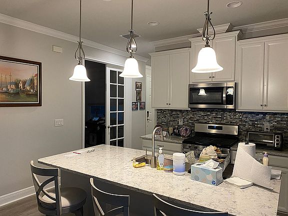 den 10'x11' kitchen island 330 square foot lanai crown molding in main areas & bedroom #1 Level 3 ceramic tile in bathrooms Epoxy garage floor Kitchen pendant lighting Stainless steel appliances