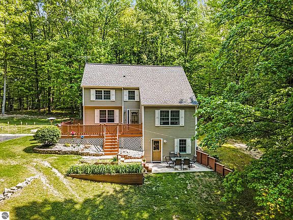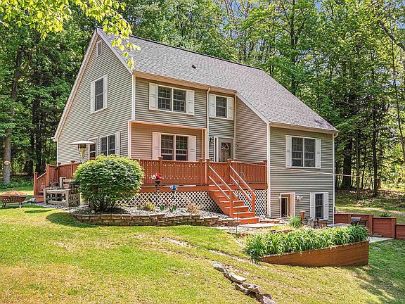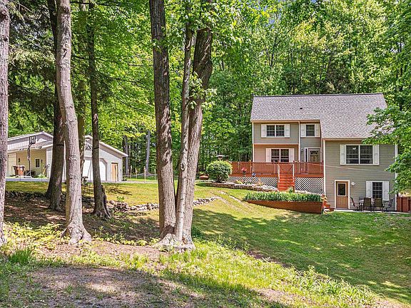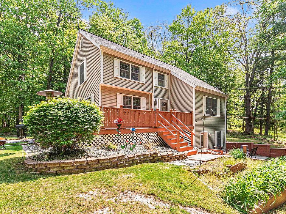 Charming home surrounded by five private acres of hardwoods and wildlife. This 3 bedroom, 2.5 bath home offers 1719sf with another 725sf of living space in the lower level walk-out. The two upper bedroom suites both boast private baths. Gorgeous views from every window, and tons of natural light! Main floor bedroom and laundry, and lower level walkout has a large recreation room and extra large storage room. Beautiful oak wood trim throughout with custom oak staircase as a center-point.. Spacious kitchen with stainless steel appliances, ready for family or holiday cooking and baking. Nice custom deck overlooking the yard, and a 3+ Car detached garage with additional pole-shed on back. Must see! *New drain field installed 4/2023.