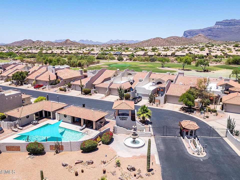 Enjoy stunning views of Superstition and Dinosaur Mountains in the gated community of Fairway Views in scenic Gold Canyon! This 1,936 sq ft single family attached home offers a great room floorplan, 2-bedroom + den. Built in 2022 with beautiful granite counters and cabinets. Plus, the home features 3 newly installed custom matching iron doors (front, back, and primary bedroom) and high-efficiency windows in entire home - enhancing both curb appeal and energy savings. Enjoy the community pool or a quick walk to the Gold Canyon Golf Resort—home of Dinosaur Mountain and Sidewinder golf courses and all the exceptional recreation and relaxation in this private community. Don't miss your chance to live in the serenity and natural beauty of Gold Canyon!